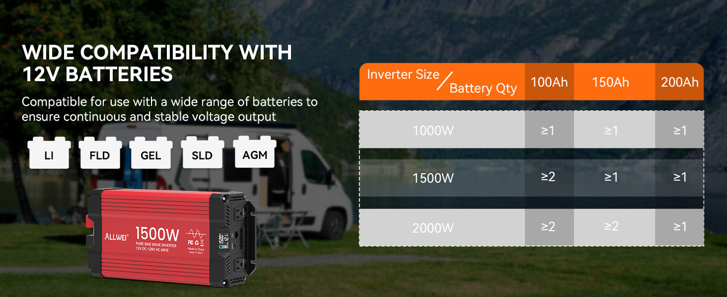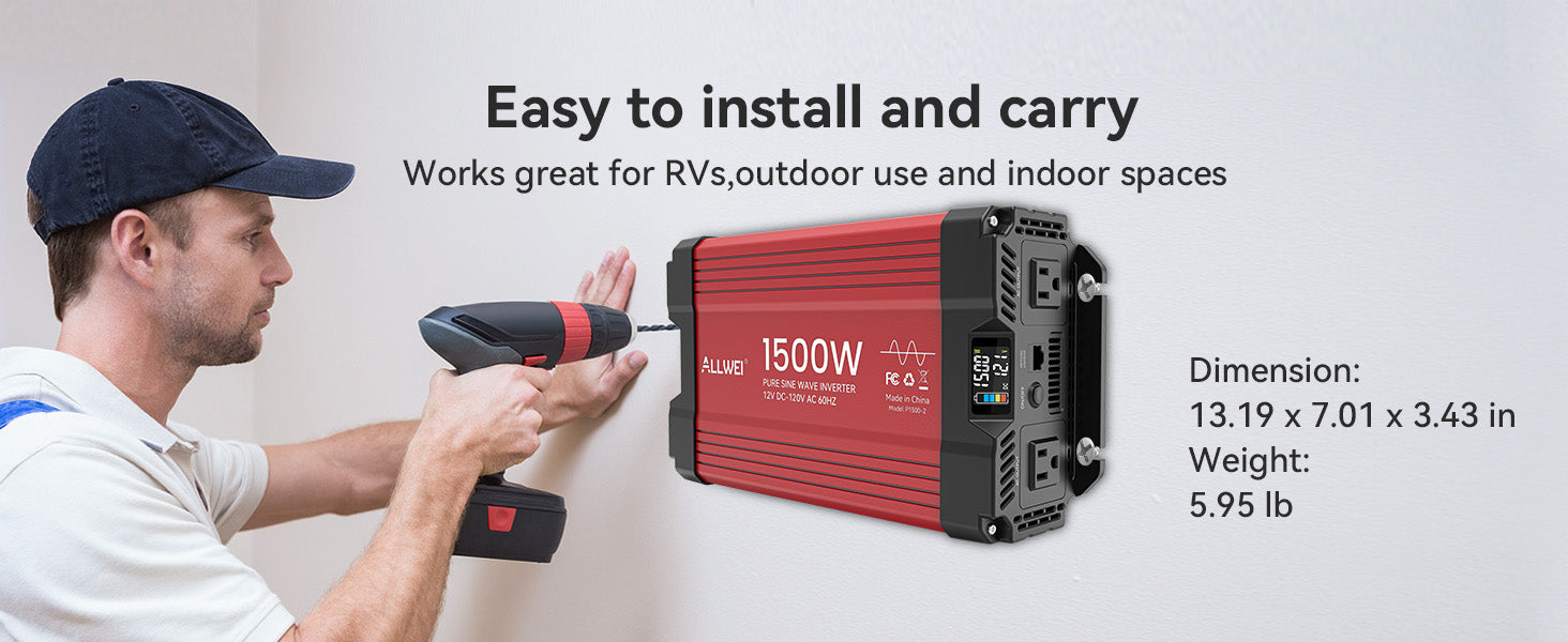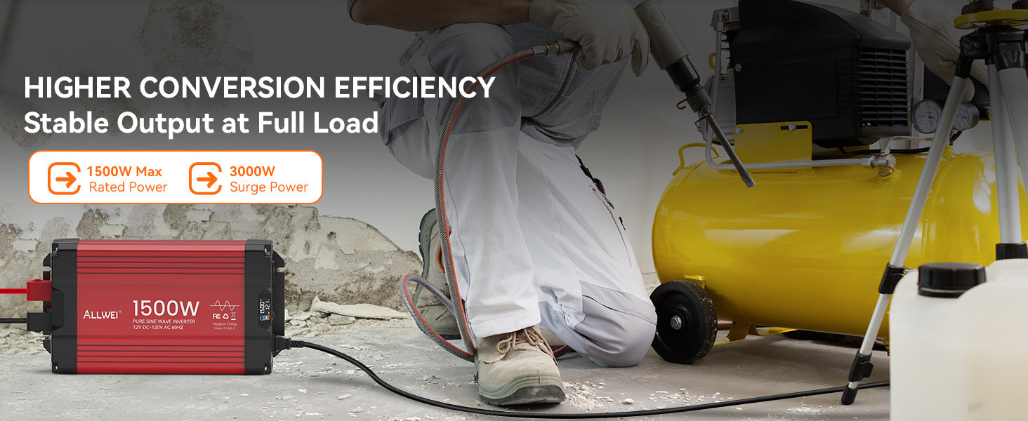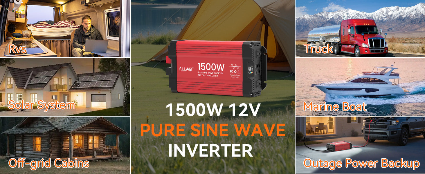ALLWEI 12V to 120V pure sine wave inverter provides 1500W continuous power and 3000W peak surge with over 92% efficiency. The durable aluminum case withstands harsh conditions. Specs: 5.95 lb, operating range: 14°F–104°F.