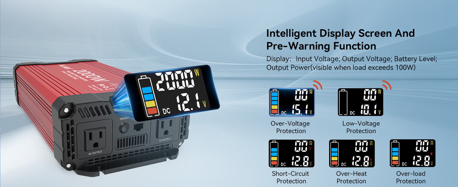 The intelligent LCD shows input/output voltage, battery level, and power usage. It alerts you to issues like voltage drops or overloads for easy troubleshooting.