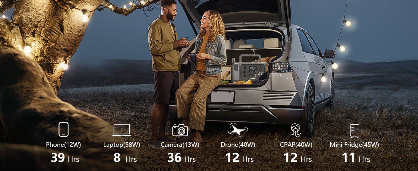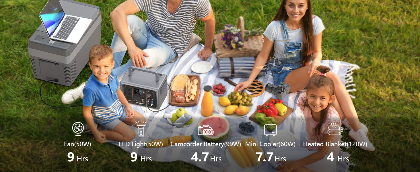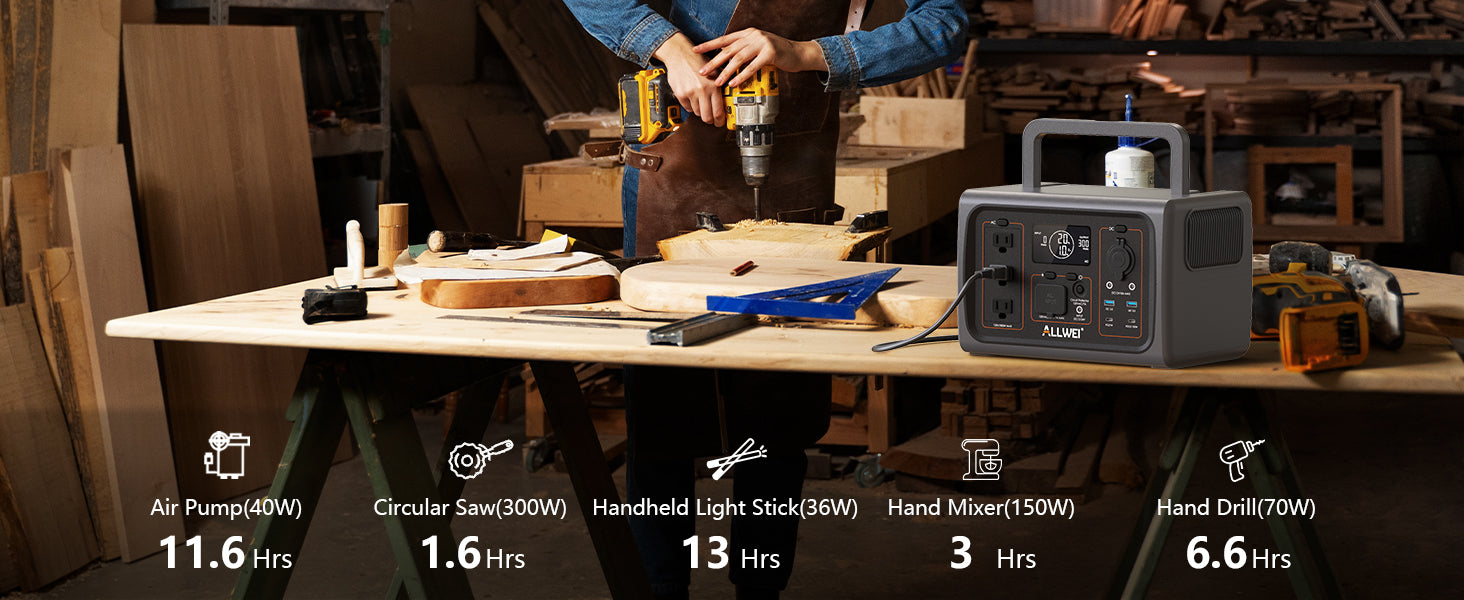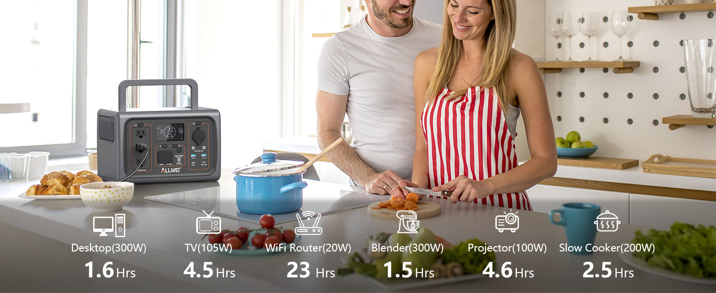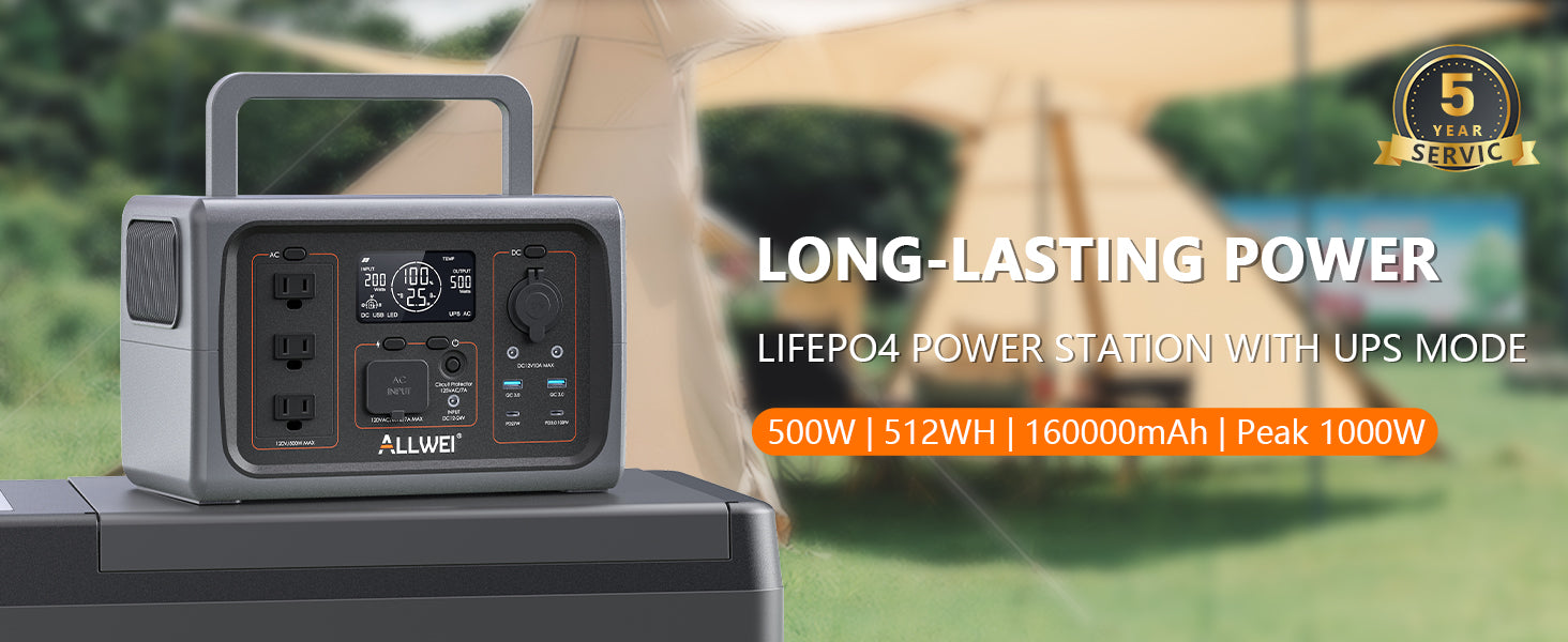 ALLWEI PPS600-5Portable Power Station charges all your essential devices, from small gadgets to high-power appliances. With 512Wh capacity, compact size, and a robust 10-year LiFePO4 battery lifespan, this power station is perfect for outdoor explorers and emergency home backup. Weighing just 13 lbs, it's lightweight and easy to carry for any adventure.